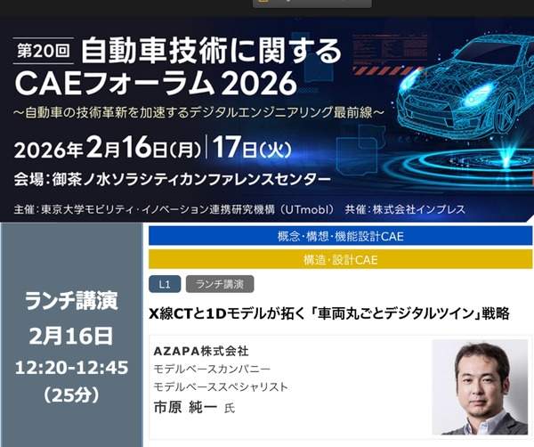 Форум, который соберется 16–17 февраля в Токио, в конференц-центре Очано Мидзу Сора Сити, – это не просто тусовка для технарей. Это 20-й по счету праздник CAE – компьютерного моделирования в автомобильной отрасли. Здесь обсуждают, как интегрировать дизайн и симуляции, чтобы автомобили рождались не на чертежных досках, а в виртуальной среде. AZAPA не просто придет с визитками: компания выступит спонсором обеда и даст ключевую речь. В 12:20 16 февраля спикер Дзюнити Итикава, модель-базед специалист из AZAPA, расскажет о стратегии "целого автомобиля в цифровом двойнике" с помощью рентгеновской компьютерной томографии (X-ray CT) и одномерных моделей (1D).