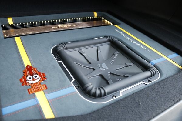Открываете багажник — и глаз сразу цепляется за центральную панель, где сабвуфер и усилитель уживаются в гармонии, словно элементы модного интерьера. Тэрадзима настоял на палитре из желтого, синего и красного — цвета, вдохновленные градациями популярного бренда Kicker. Желтые и синие линии пересекаются, подчеркивая красные стежки, создавая эффект, будто багажник дышит энергией. Это не случайный выбор: Kicker, основанный в 1980-х в США, давно славится своими квадратными сабвуферами L7, которые не только качают басами, но и выглядят как скульптуры. Факт: эти сабвуферы используются в профессиональных инсталляциях, где низкие частоты достигают 130 дБ без искажений, что идеально для Harrier с его изолированным салоном.