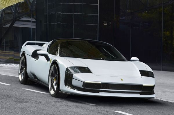 Сбоку глаз цепляет переосмысленный NACA-duct – классический воздухозаборник для интеркулера, теперь с большой треугольной карбоновой пластиной, которая добавляет драмы. Фронт – чистый минимализм: фары в углах, интегрированные в чёрный корпус, тянущийся к нижнему воздухозаборнику. Всё это вдохновлено промышленным дизайном – геометрия, как у精密ного механизма, но с мускулистыми формами, которые шепчут: "Я всё ещё Ferrari". А зад? Короткий, собранный, с намёком на те самые боковые выхлопы F40, только теперь они скрывают электрические секреты.