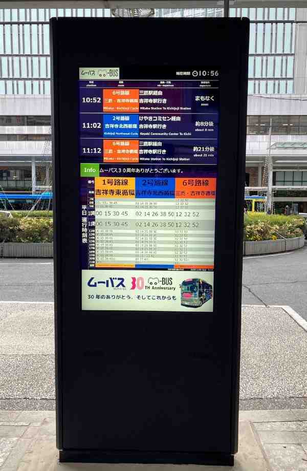 В центре внимания – "Smart Bus Stop" от YE DIGITAL, интегрированная с системами NEC, такими как "Bus Navigation System for SaaS" и "Multi-Purpose Information Delivery Service for SaaS". Установлена она на северном выходе станции Кицудзи, где сходятся три ключевых маршрута: 1-й (восточная петля Кицудзи), 2-й (северо-западная) и 6-й (циркуляция между Кицудзи и Митакой). Раньше здесь царил хаос: пассажиры путались в номерах, а задержки превращались в лотерею. Теперь же цифровой экран показывает реальное время подхода автобусов, используя данные из навигационной системы. Хотите знать, когда придет следующий "Мувас"? Экран подскажет – и на японском, и на английском, благодаря поддержке многоязычности.