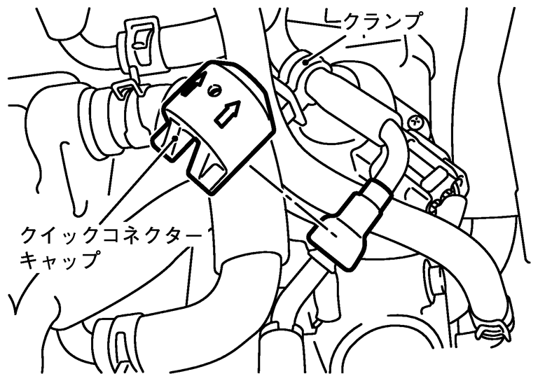 - 4.フューエルフィードホースがホースブラケットに固定されていない状態で、クイックコネクターを手で強く引っ張り、フューエルチューブから抜けないことで確実なかん合状態を確認する。