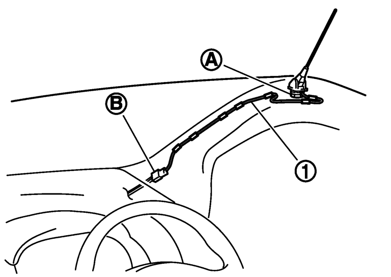 3.クリップ及びコネクター(B)を外し、アンテナフィーダー(1)を車両から取り外す。
