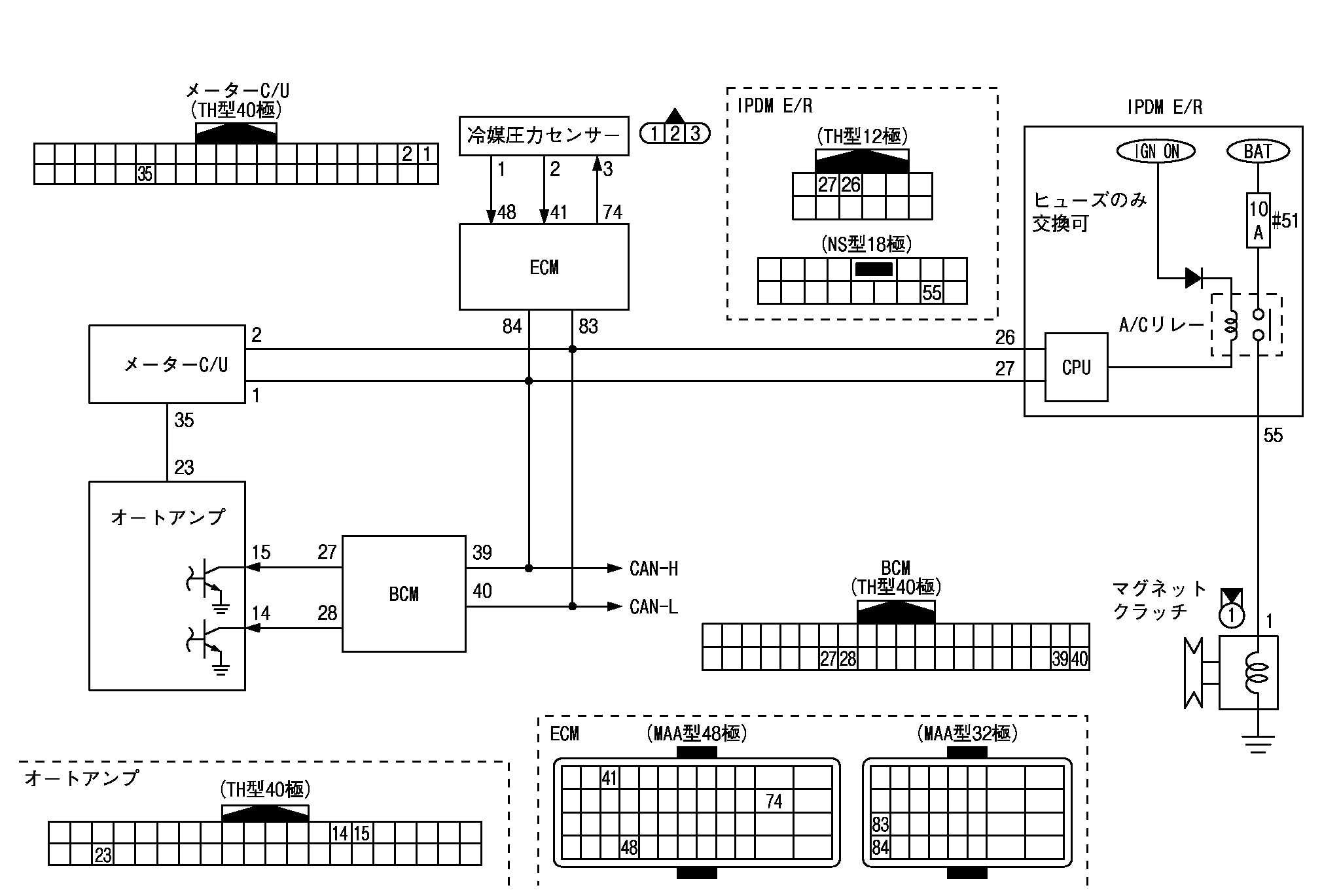 現象:ブロアファンモーター作動時、A/CスイッチをONにしてもマグネットクラッチが作動しない。