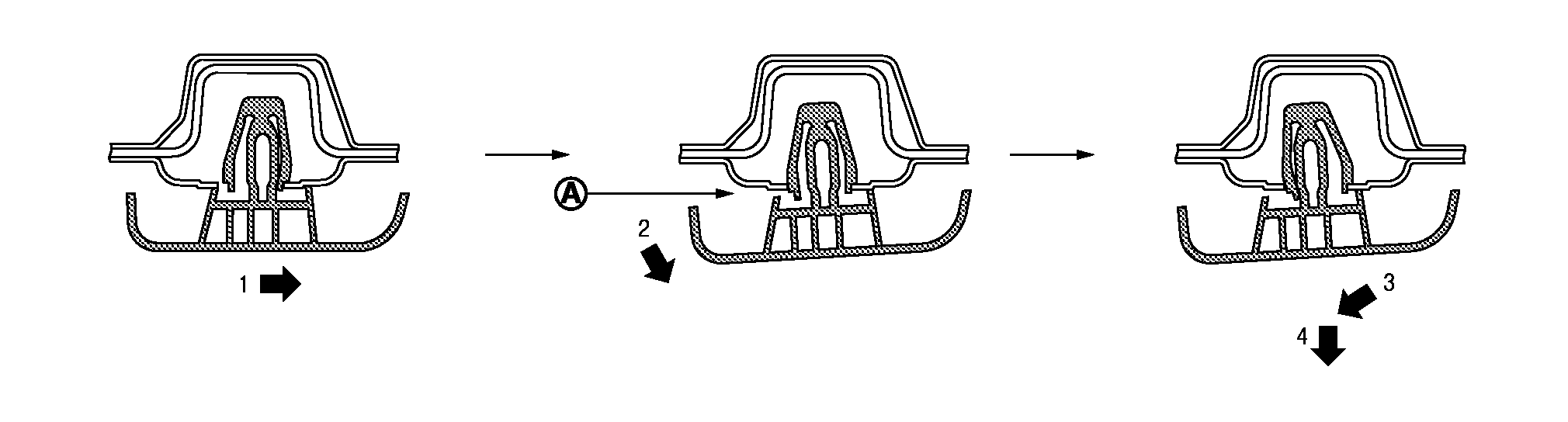 取り付けの際は、樹脂クリップが車体側の穴に確実に合っていることを確認してから押し込むこと。