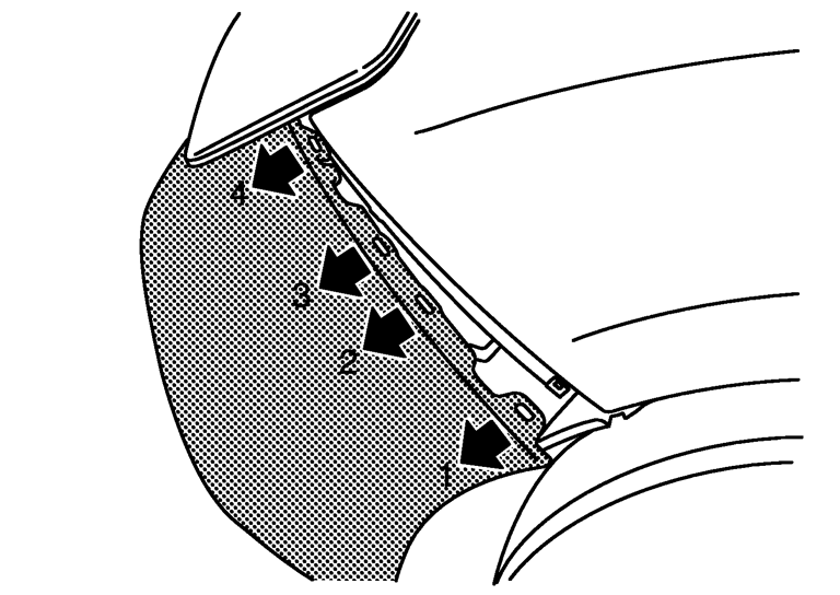 - 7.バンパーフェーシア両サイドを持ち上げて、図の 1 から 4 の順に車両側方へ引っ張りバンパーサイドブラケットのかん合を外す。