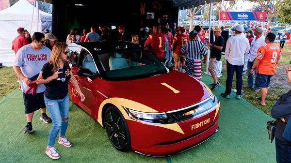 AFEELA 1 — не просто машина, а манифест будущего мобильности. Sony и Honda, два гиганта электроники и автопрома, объединились в 2022 году, чтобы создать бренд, который звучит как sci-fi триллер: AFEELA. Их первый продукт, седан-кроссовер на электрической платформе, обещает дебют в 2026-м, но уже сейчас он красуется в кастомном облике. Американское подразделение Sony Honda Mobility of America (SHMA) не стал ждать массового производства — сразу взялись за тюнинг под тему USC Trojans. На домашнем матче против Michigan State University в легендарном Los Angeles Memorial Coliseum AFEELA 1 предстал в полной боевой раскраске: виниловая плёнка в фирменных цветах университета, интерьер, пропитанный тем же кардинальным и золотым, и даже медиа-бар на кузове с графикой "USC × AFEELA". Внутри — панорамный экран, задняя развлекательная система и ambient-подсветка, настроенные под атмосферу стадиона. А звук e-Motor? Теперь он рычит, как будто подбадривает четвертьбэков.