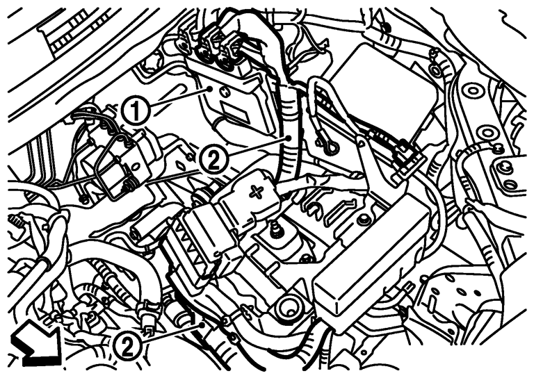- 6.左エンジンマウント周辺、及び左フェンダー内でエンジンルームハーネス(2)の接続先[ECM(1)、CVT C/U等]を全て分離し、エンジンルームハーネスをエンジン側に仮止めしておく。