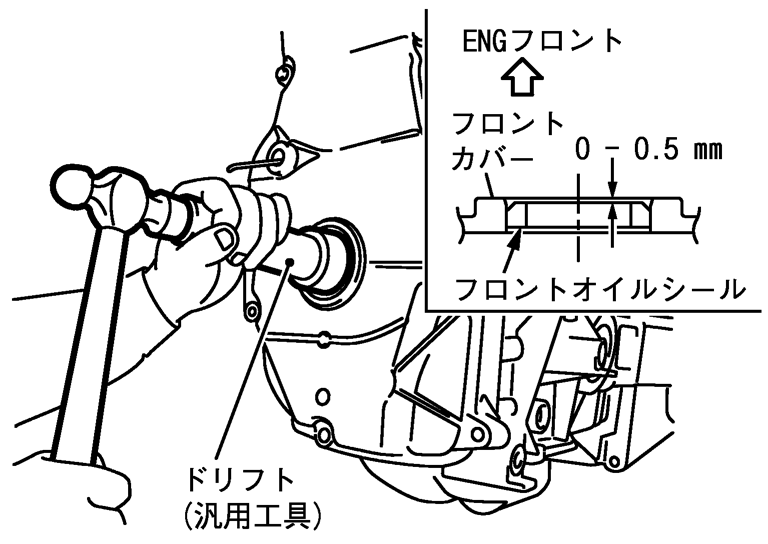 フロントカバー、及びクランクシャフトに傷を付けないよう注意すること。