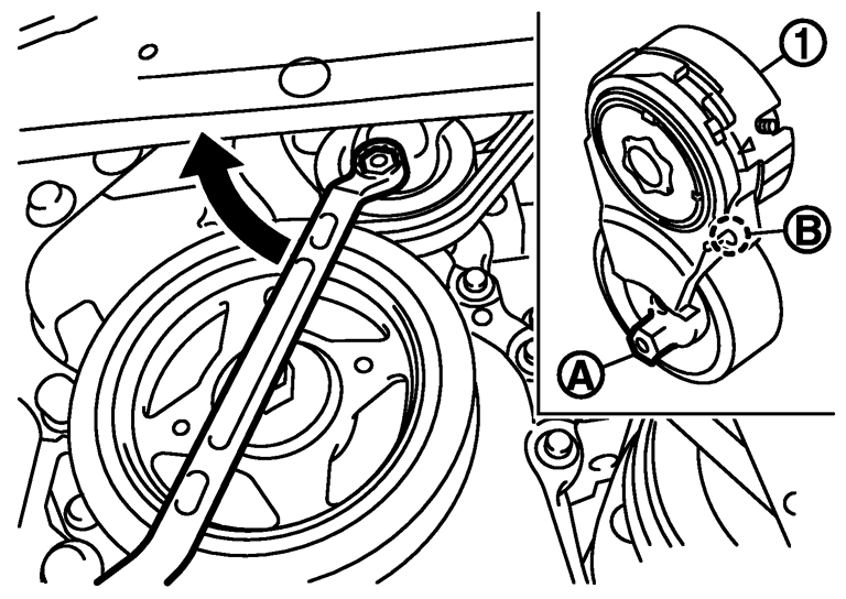 取り付け- 1.補機ベルトオートテンショナー(1)の六角部(A)をメガネレンチ等で確実に保持し、矢印方向に移動させる。
