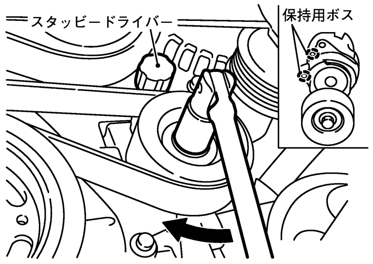 保持工具が外れた場合を考慮して、挟む危険のある位置に手を入れないこと。- 2.上記の状態で直径約6 mmの丸棒(プラスのスタッビードライバー等)を保持用ボスに差し込んでテンショナーのプーリーを固定する。