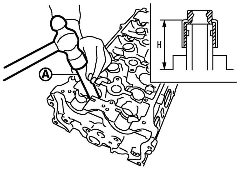 2.バルブオイルシールドリフト[特殊工具: KV10115600](A)を使用して、バルブオイルシールを図の高さになるよう圧入する。