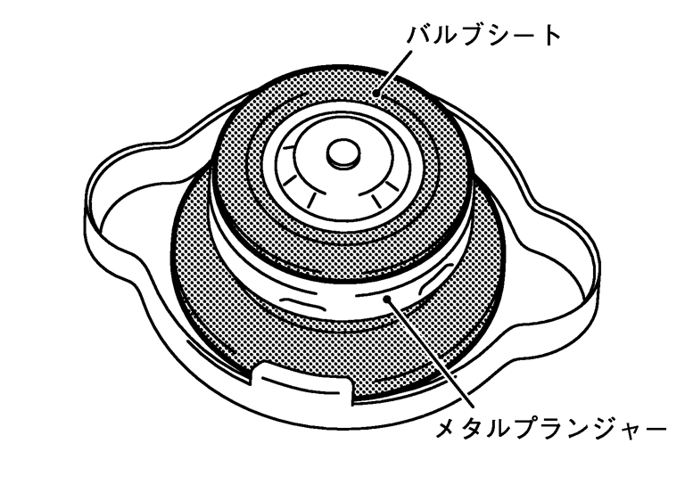 ラジエーターキャップ点検- ラジエーターキャップのバルブシートの汚れ、損傷がないことを点検する。■ 注意 ■バルブシートを垂直に見て下のメタルプランジャーが見えなくなる程バルブシートが広がった場合はラジエーターキャップを交換すること。