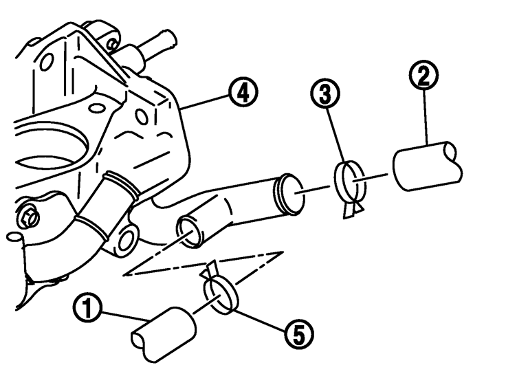 ヒーターホース(2)を取り付ける前にCVTウオーターホースをウオーターアウトレット(4)に取り付けること。