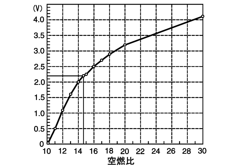 センサが理論空燃比付近の狭い範囲で出力電圧がON/OFF(リッチ、リーン)的に変化するのに対して、空燃比センサは幅広い空燃比に対して、出力電圧が 約0 - 約4Vの間で変化する。
