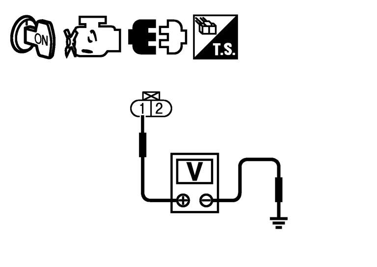 4. CONSULT-IIIまたはテスタを用いて、インテークバルブタイミングコントロールソレノイドバルブ1番端子とアース間の電圧を点検する。