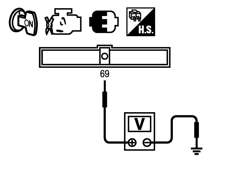- 下記の条件下でECM69番端子(パーク/ニュートラルポジションスイッチ信号)とアース間の電圧を点検する。