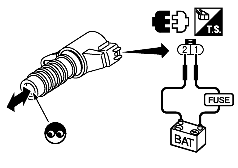 4.端子に12V電圧を加えたとき、図のようにインテークバルブタイミングコントロールソレノイドバルブ内のプランジャが作動することを確認する。