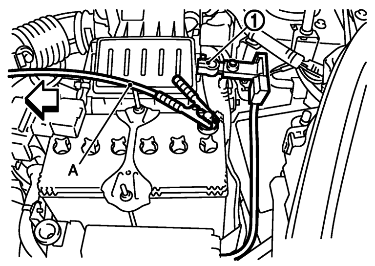 2.車両に取付けられたバッテリマイナス端子ケーブル(1)と、同等以上の太さのケーブル(A)をバッテリマイナス端子とボディアース間に接続する。