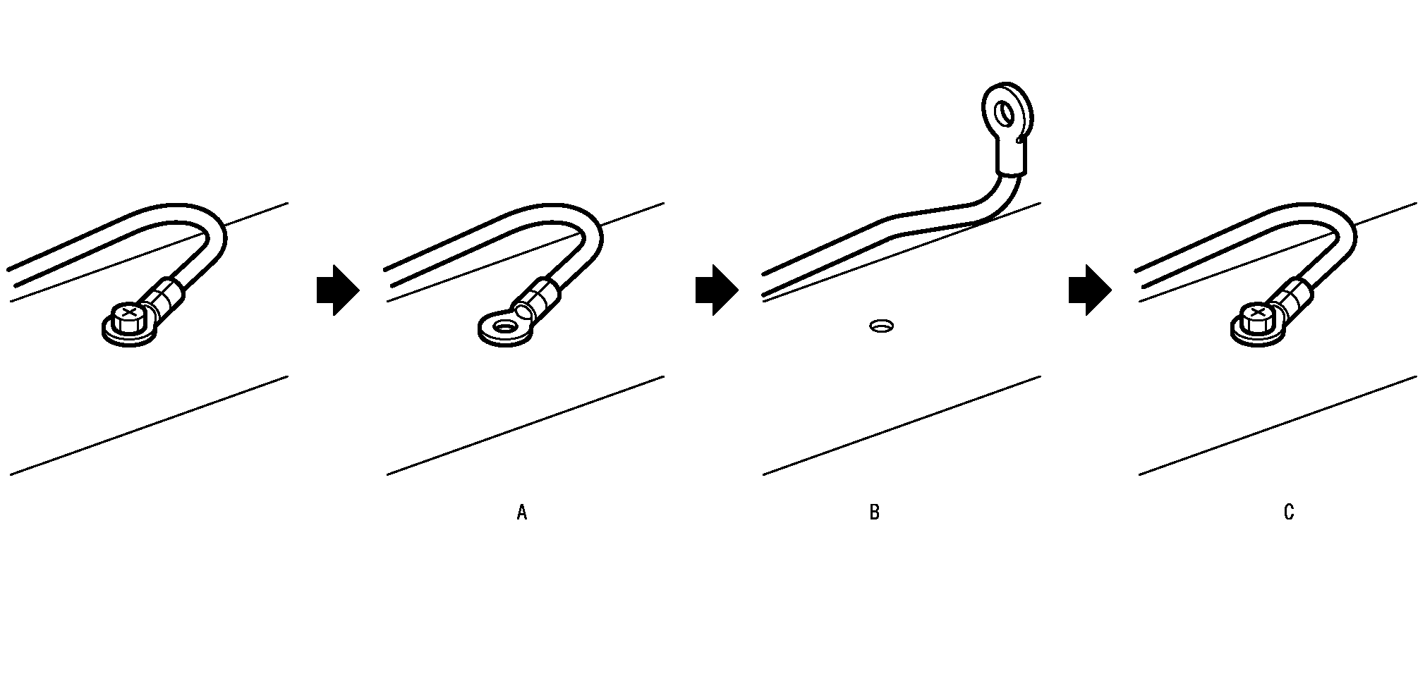 A:ボルト(スクリュ)を外す。B:接合面に曇り、汚れ、さび等がないか点検する。より良い接続を保証するために、必要とされる清掃を行う。C:ボルト(スクリュ)を確実に取り付ける。