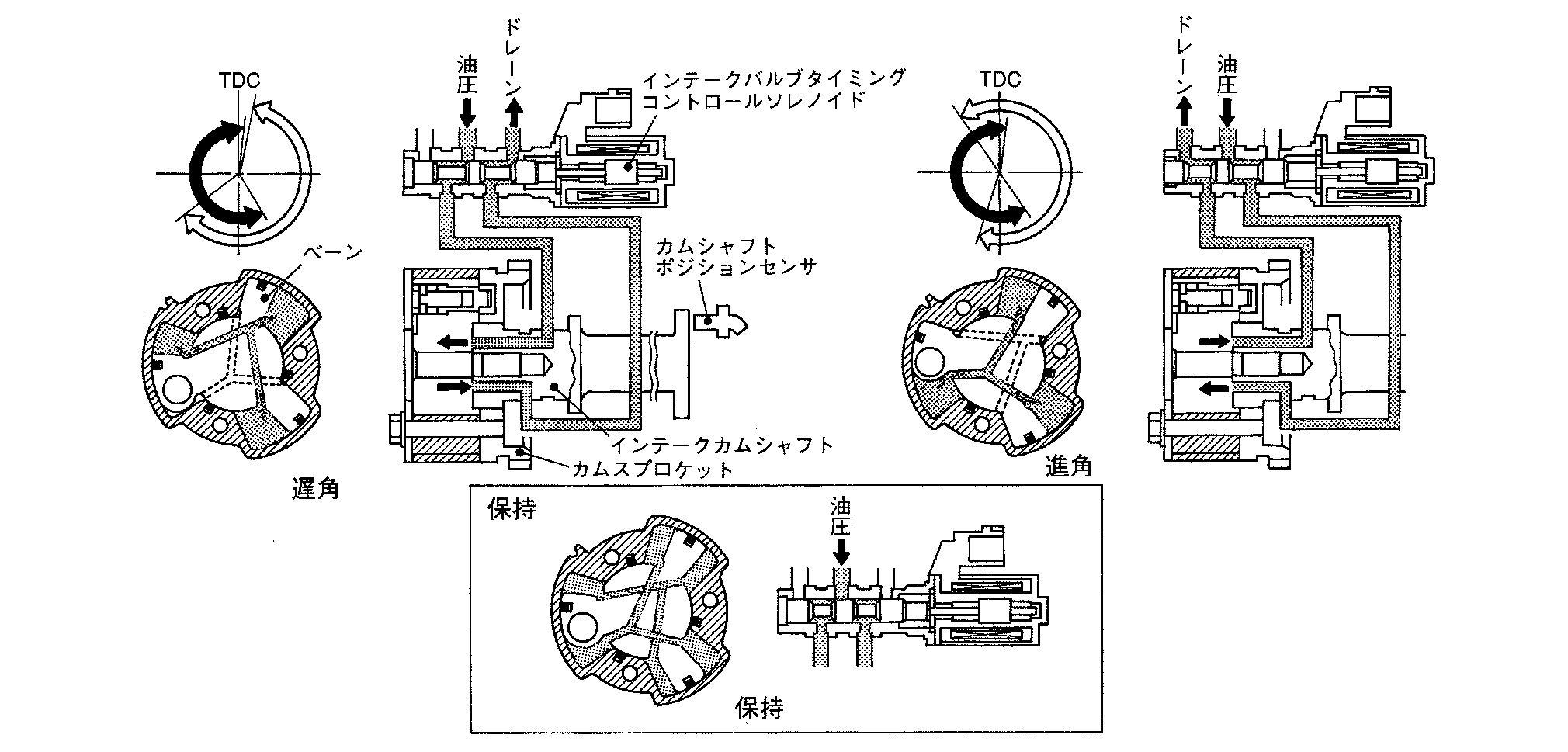 インテークバルブタイミングコントローラはインテークバルブタイミングコントロールソレノイドバルブにより油圧制御されます。