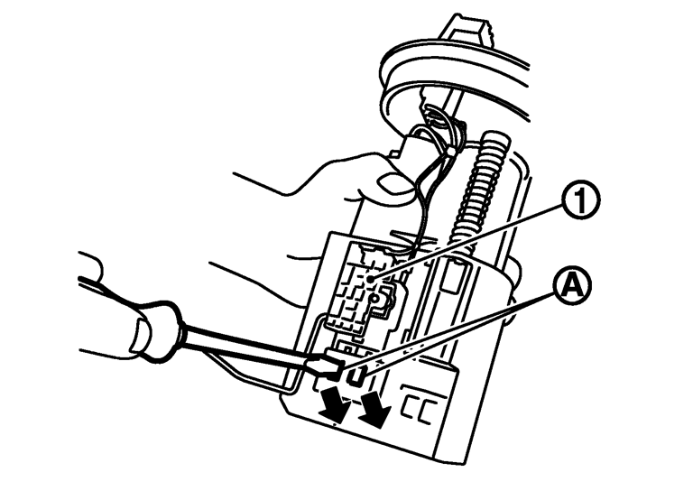 (1)フューエルゲージ取付部の爪(A)をマイナスドライバー等で矢印方向に押してロックを外す。