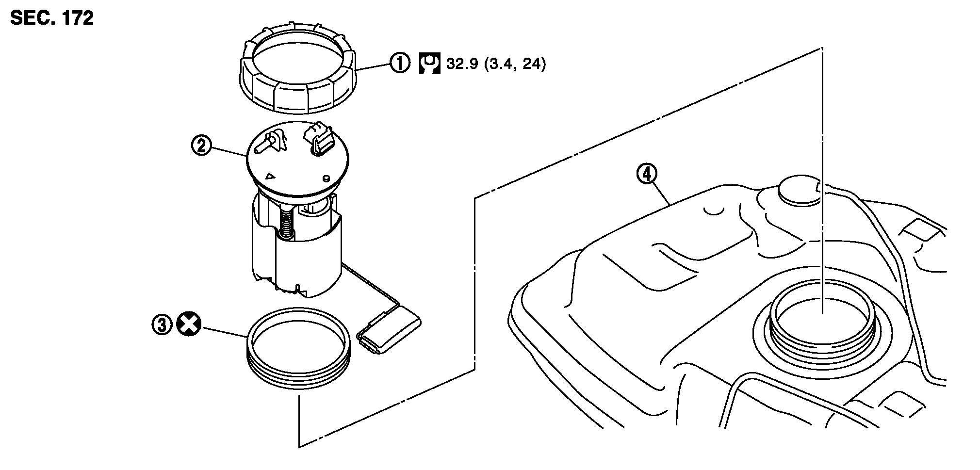 - 構成図はMR18DEを例に示す。HR15DEはフューエルゲージ·フューエルフィルター·フューエルポンプASSYの本体形状が図と異なる。
