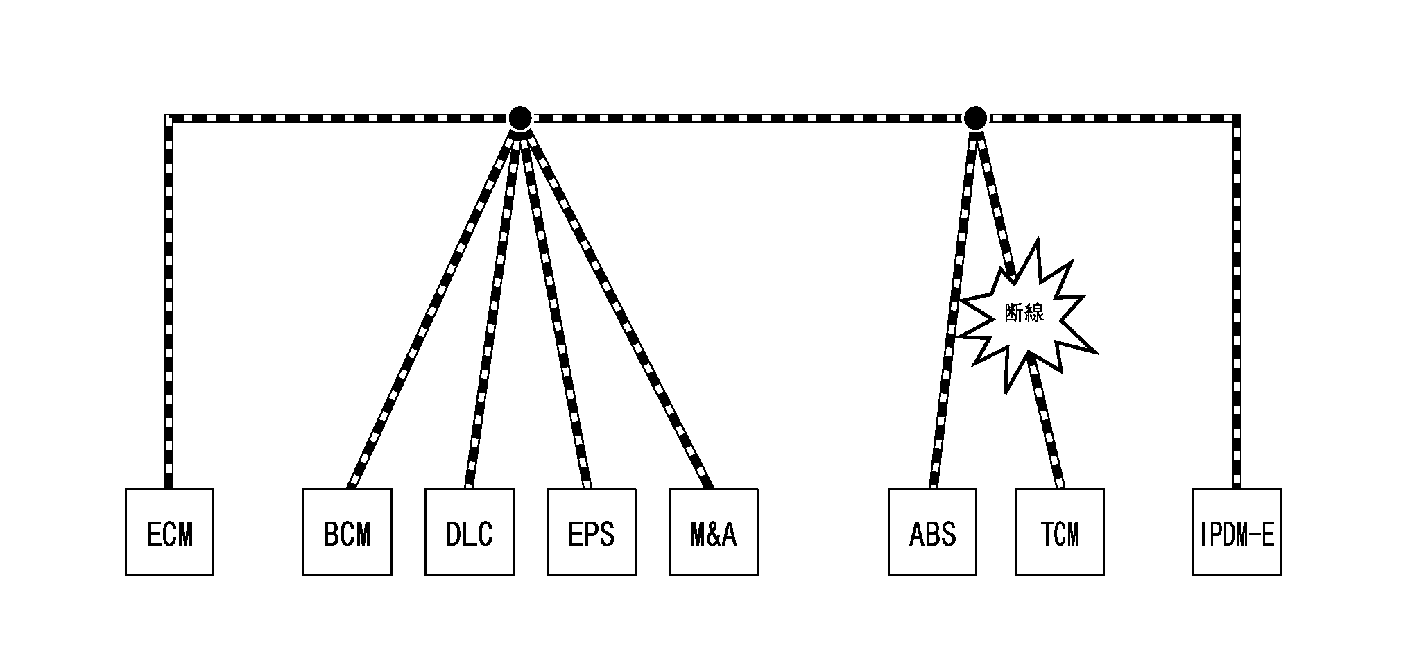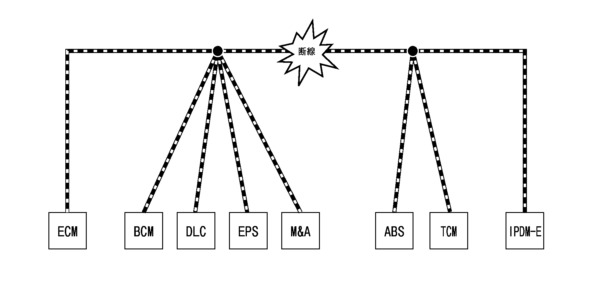 CAN通信システムは複数のユニットが互いに信号を送受信している。CAN通信線に断線等の不具合が発生すると、各ユニットが制御に必要な信号を送受信できなくなる。よって不具合箇所に関連した複数のコントロールユニットが作動不良又はフェイルセーフモードになる。