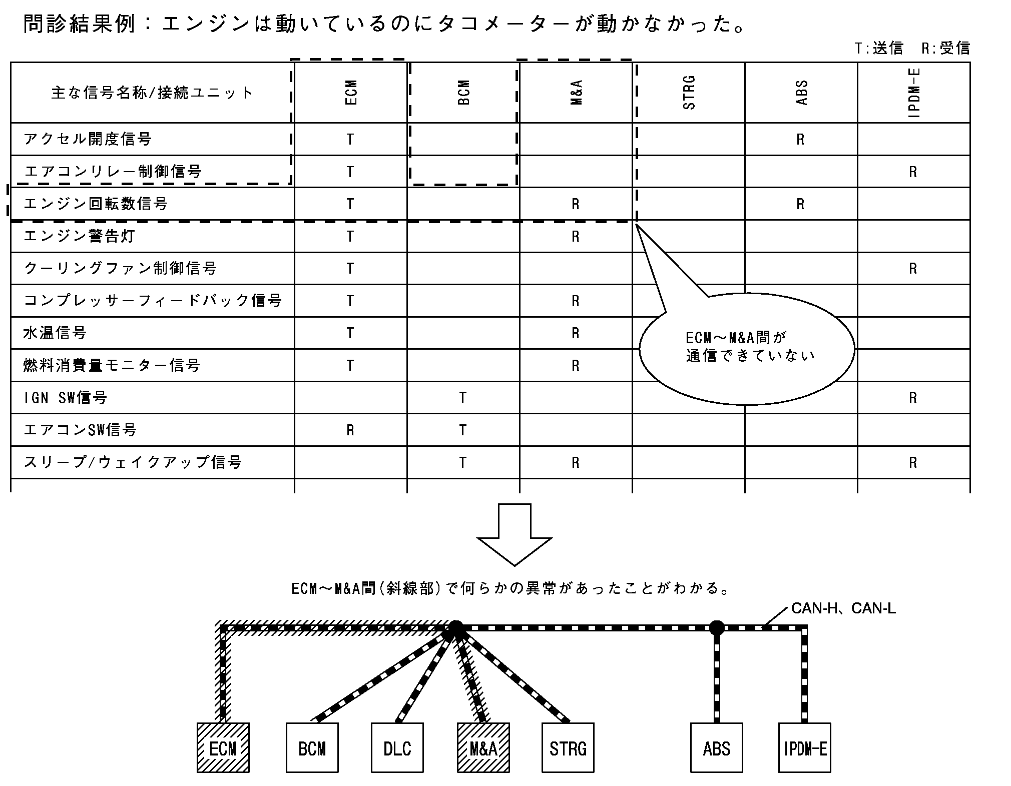 「CAN通信信号一覧表」中の信号は、各コントロールユニット間で送受信している信号のうち、故障診断に必要な信号をまとめたものである。お客さまの問診情報を基に、「CAN通信信号一覧表」から現象に関係する信号を見つけ、送受信ユニットを確認することで、故障部位の特定に役立つ。