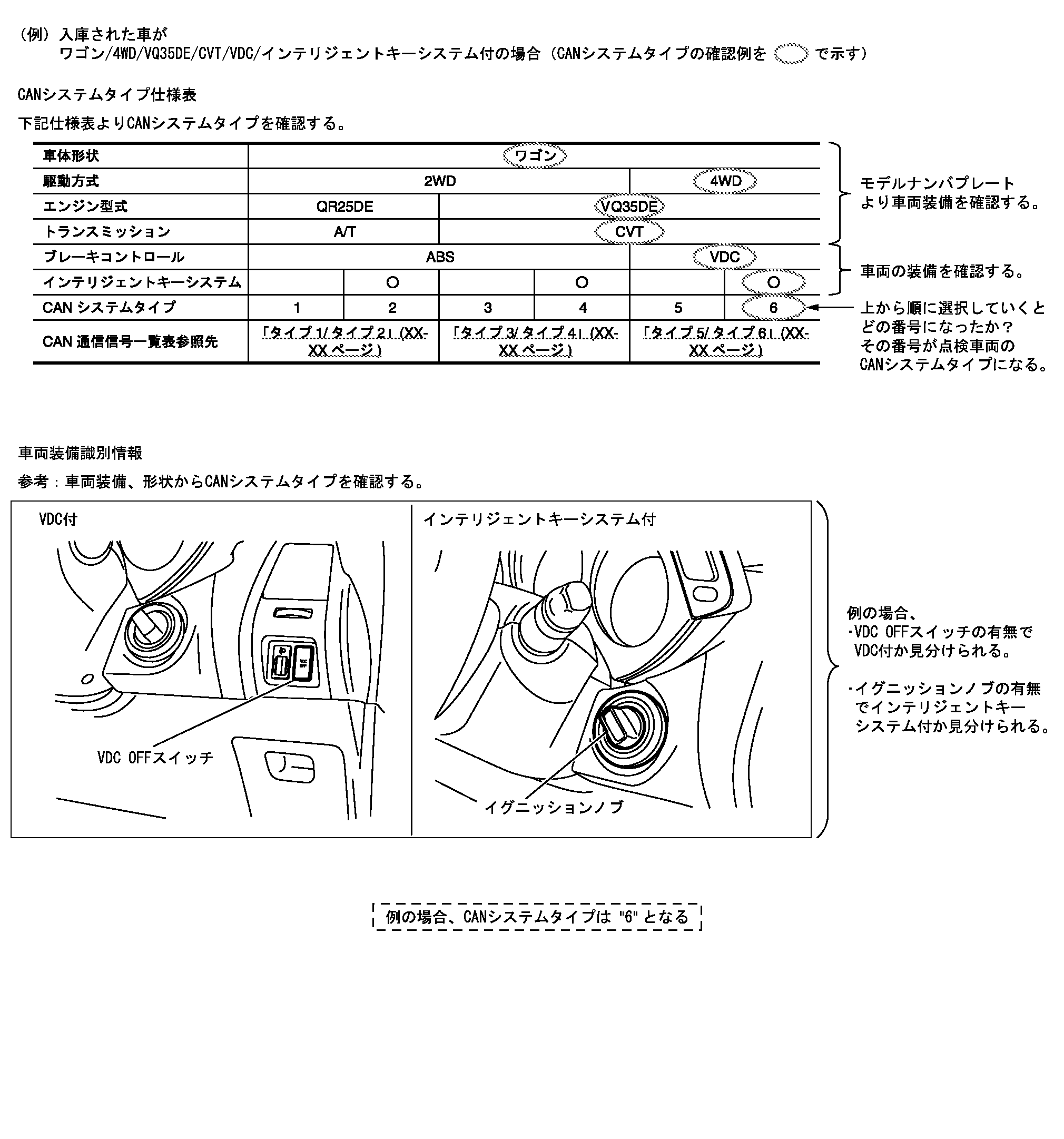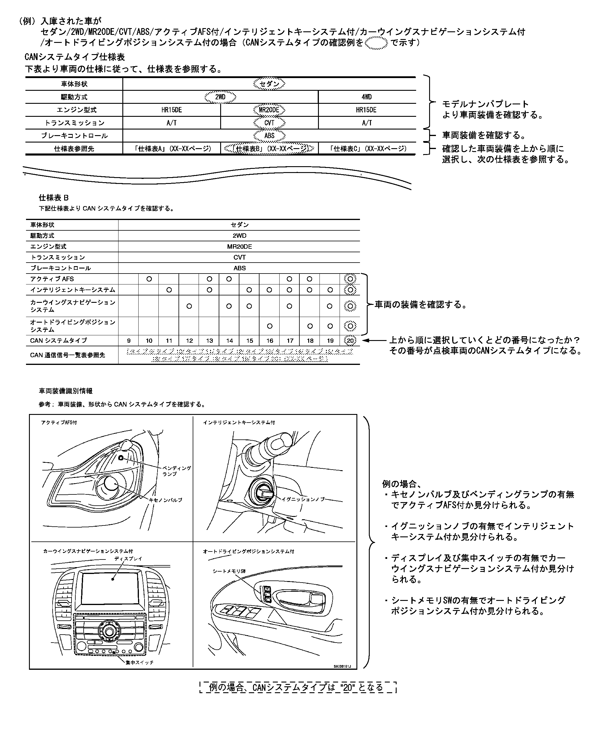 仕様表の下にある「車両装備識別情報」を使用することでCANシステムタイプの確認が容易に行える。