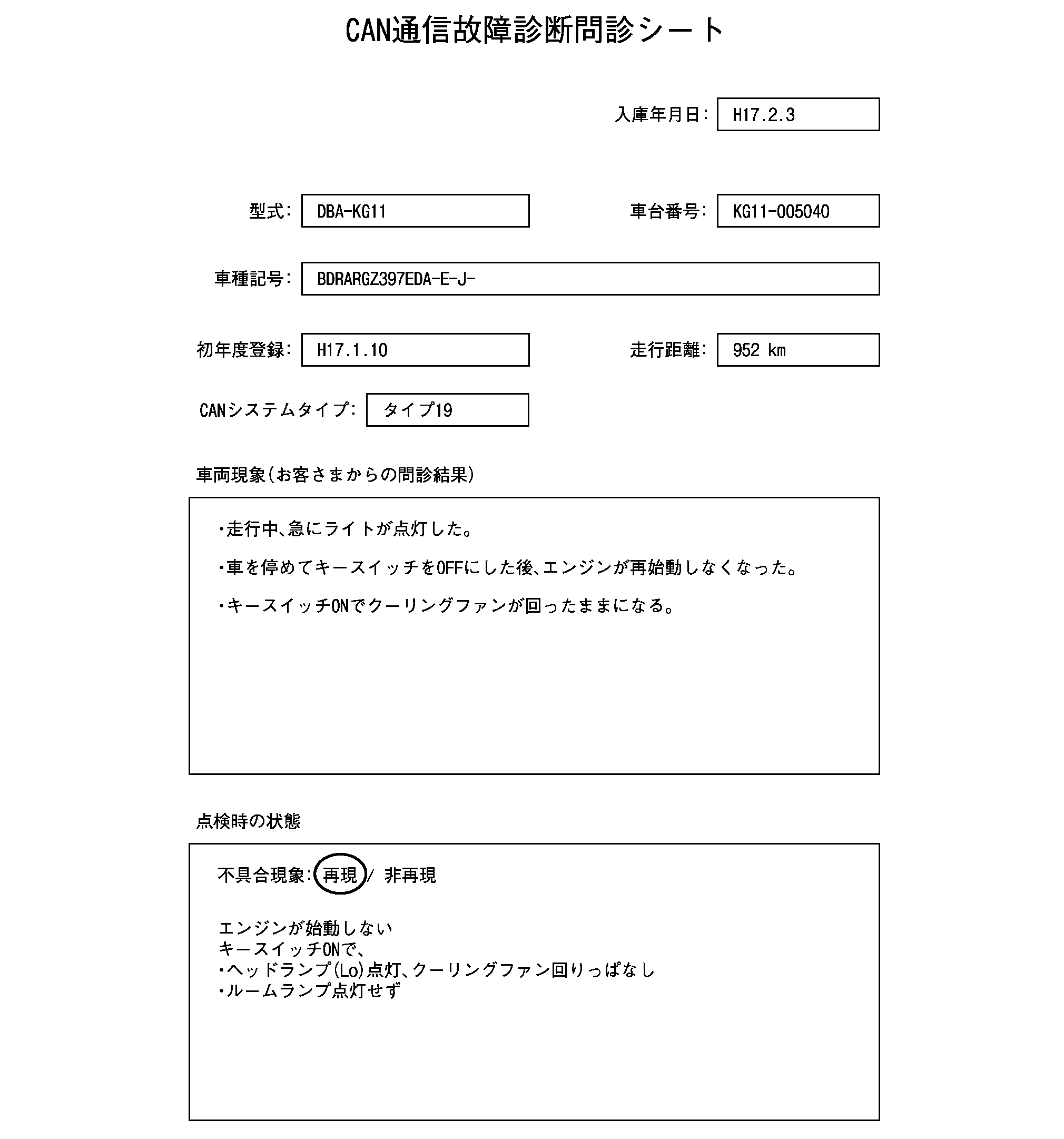 お客さまから確認した問診情報、確認した車両状態及びCANシステムタイプを「問診シート」に記入する。