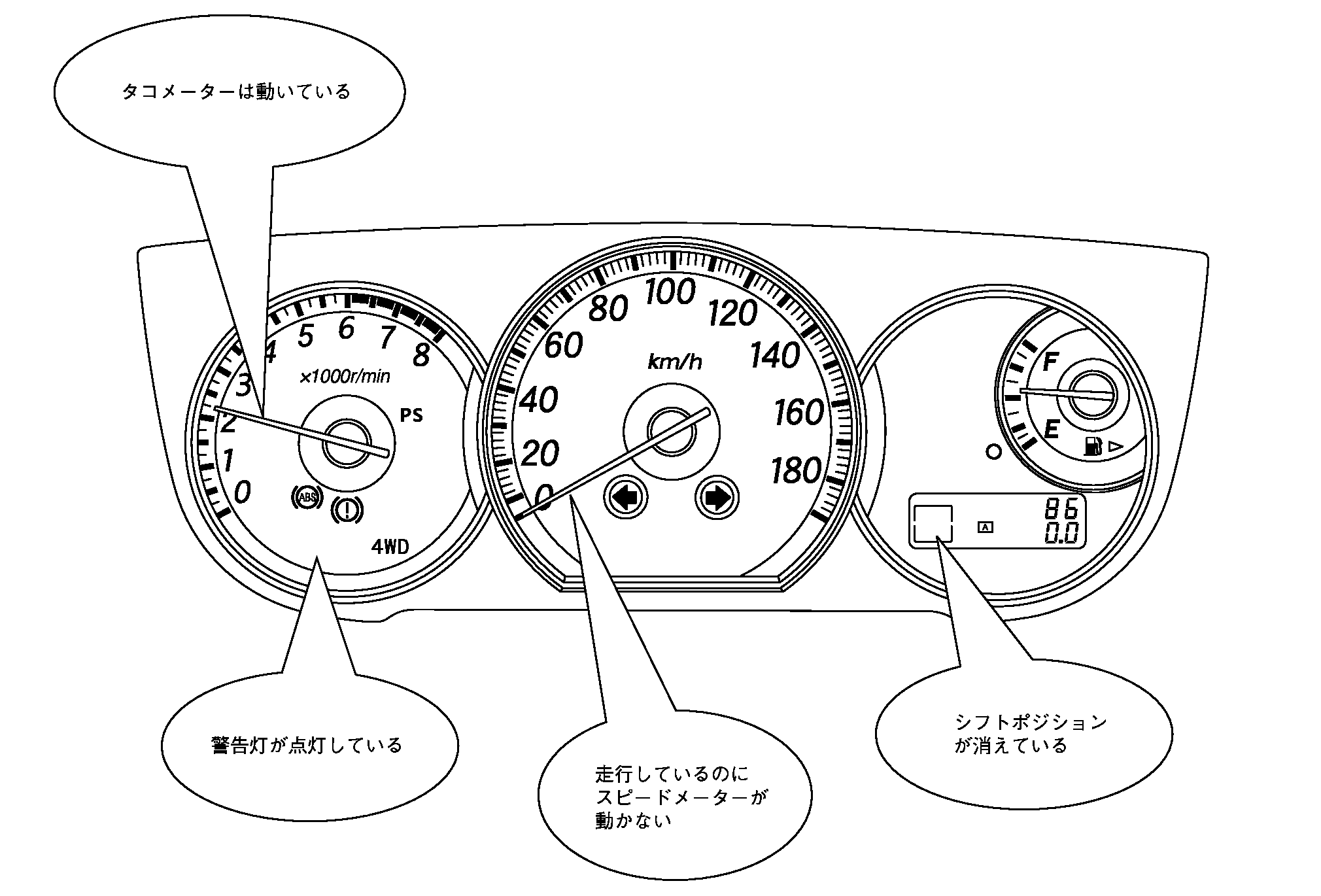• (例):タコメータが正常に作動していることがお客さまから確認できれば、少なくともECM〜コンビネーションメータ間は正常だと推測できる。