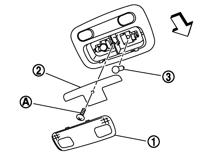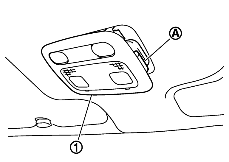 1.クリップドライバー等を使用して、マップランプ(1)のメタルクリップ部(A)を押し、取り外す。