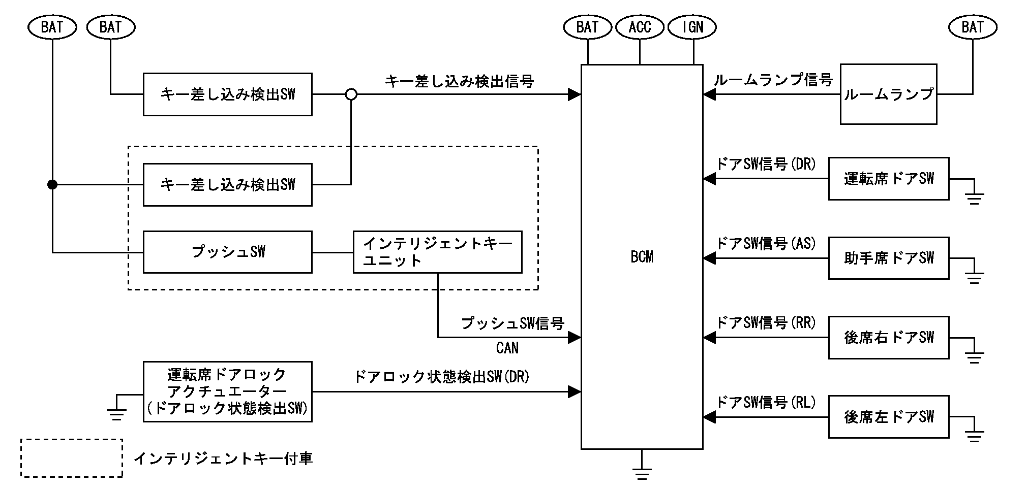 - ルームランプタイマールームランプスイッチがDOOR位置のとき、各ドアSW信号、キー差し込み検出SW信号、プッシュSW信号(インテリジェントキー付車)、ドアロック状態検出SW(DR)信号*によりルームランプの点消灯を最大30秒間(工場出荷時は15秒間)*タイマー作動させる。また、点消灯時に最大5秒間(工場出荷時は、点灯時1秒間、消灯時3秒間)*の増減光を行う。