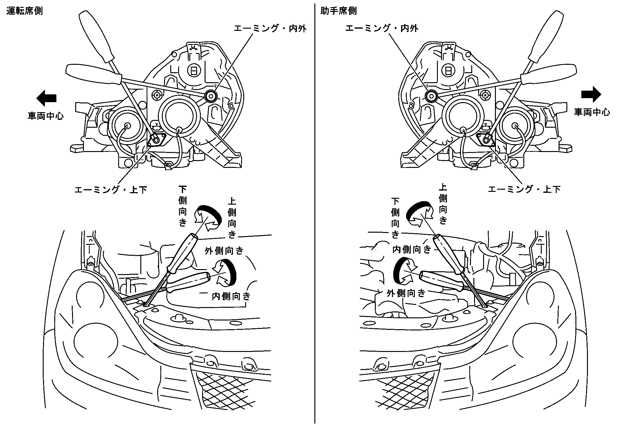 - 調整スクリューの位置と回す方向は図を参照する。■ 注意 ■ランプ点灯中は、エーミング調整スクリュー以外のランプ各部(金属部分、コントロールユニット、ハーネス、バルブ、ソケット)に手を触れないこと。