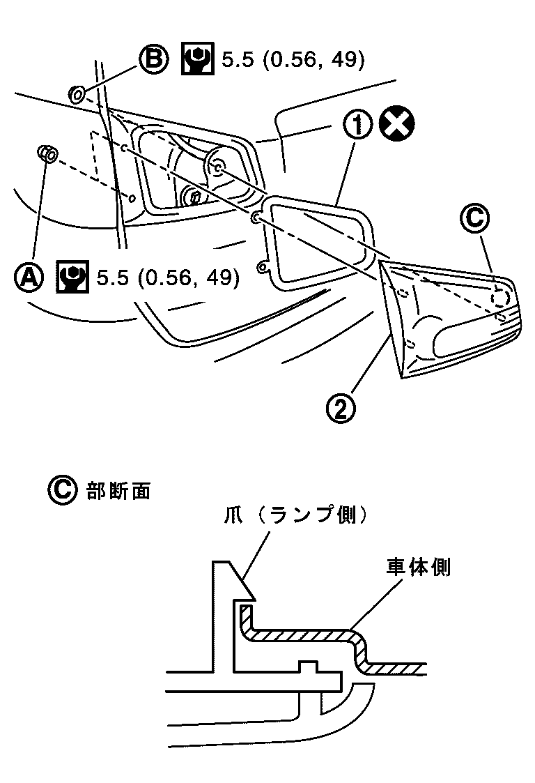 3.リバースランプ取付ナット(A)、(B)、及び爪部(C)を外す。