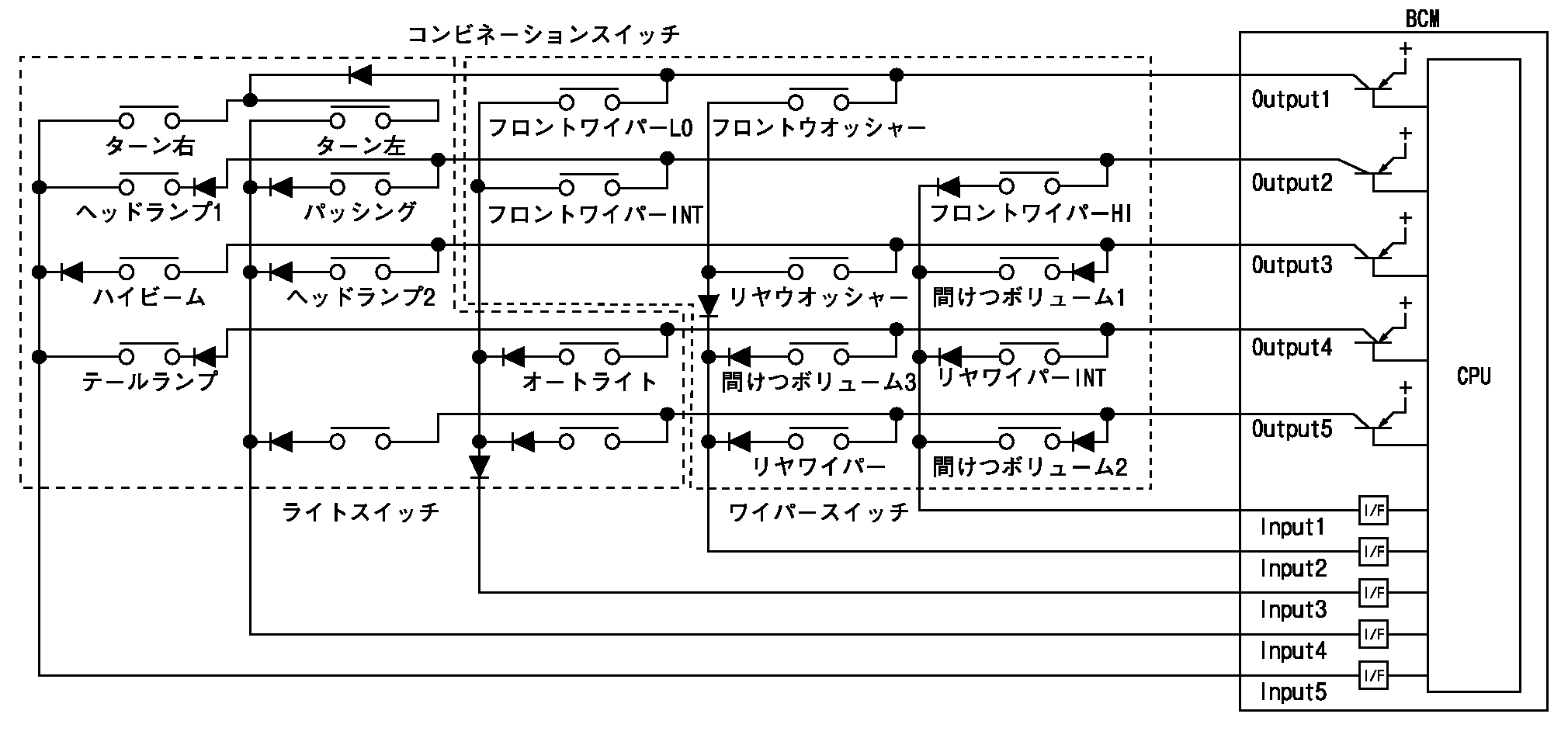 - BCMは5つの出力端子(OUTPUT 1〜5)と5つの入力端子(INPUT 1〜5)の組み合わせで、最大20種類のスイッチ情報を読み取る。