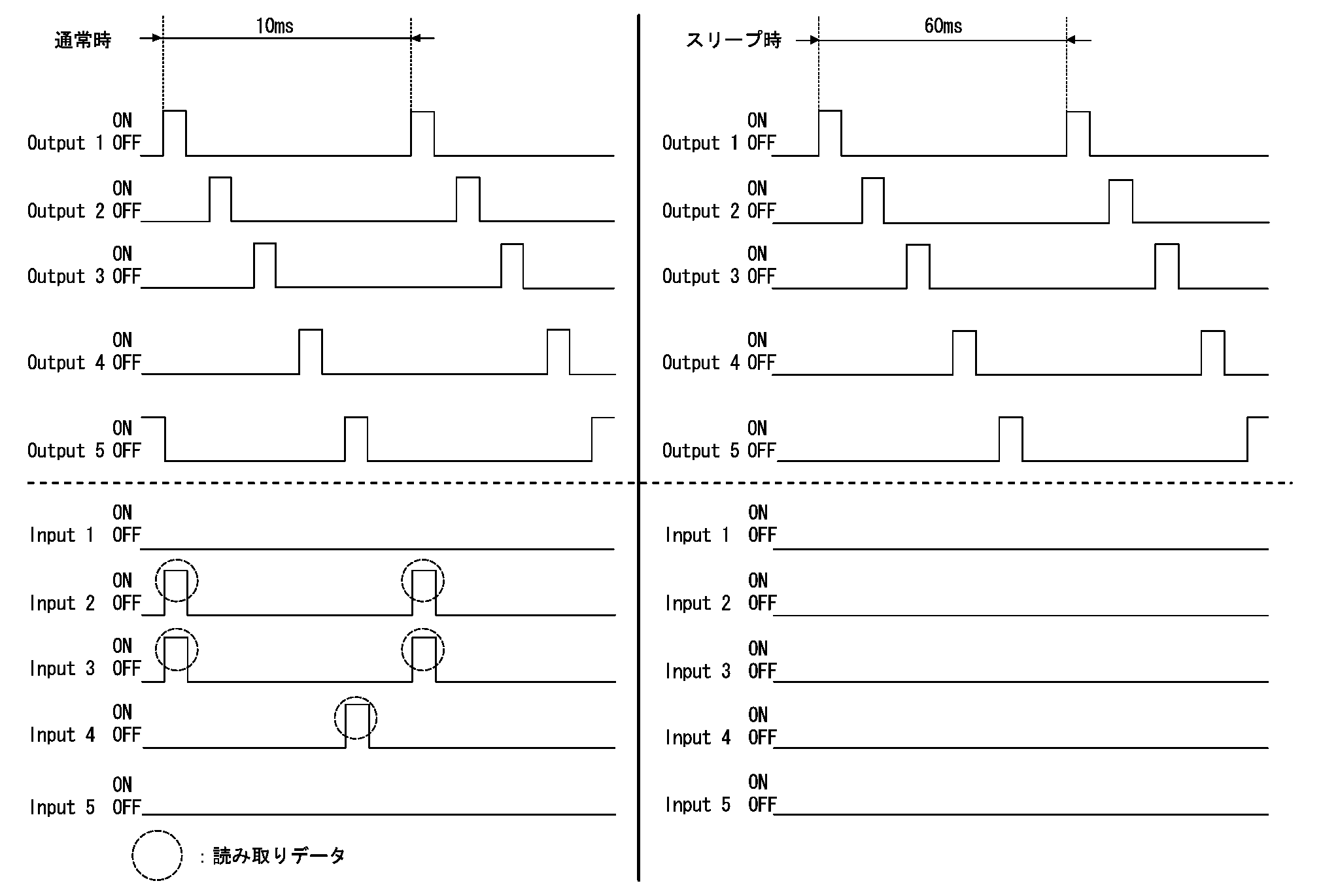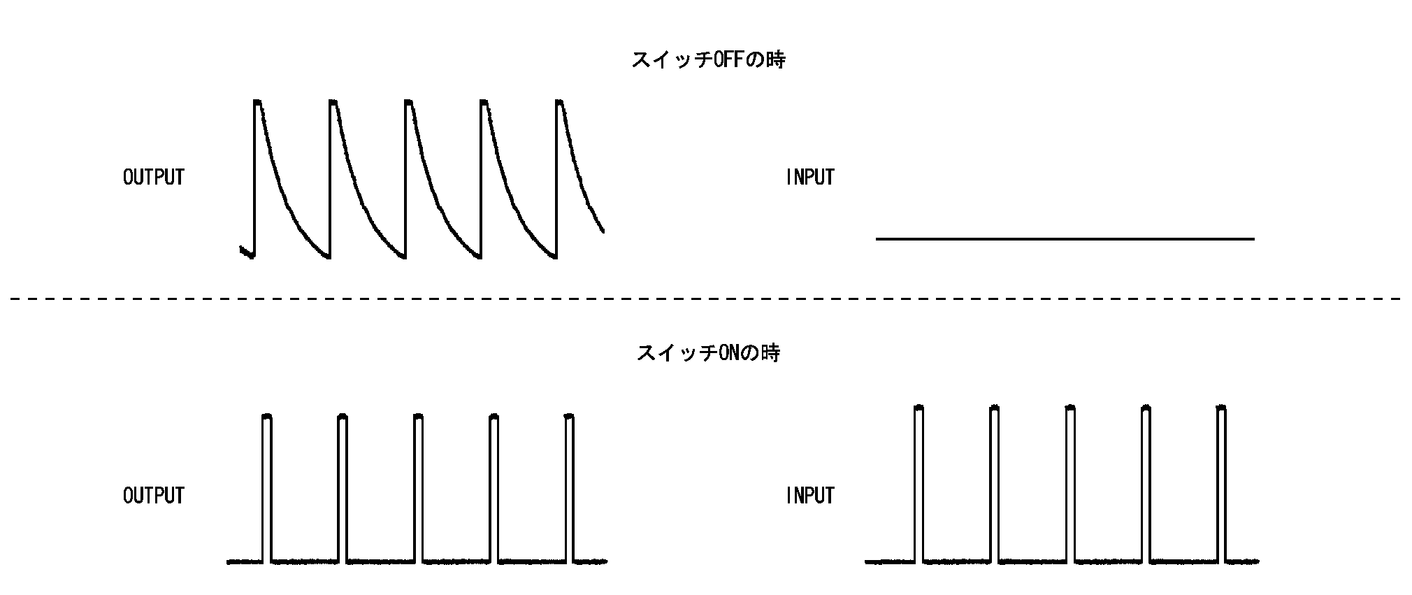 作動例・・・(テールランプスイッチをONにした場合)- テールランプスイッチ(ライトスイッチ1段)をONにすると、コンビネーションスイッチ内の接点がONになる。このとき、OUTPUT 4のトランジスタが作動すると、INPUT 5で電圧が変化したことを検出する。