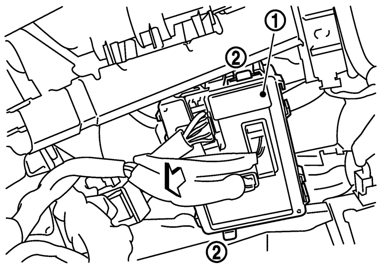 )へ引き、BCM取付ブラケット(2)から引き抜く。