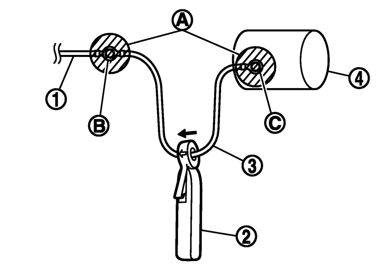 1 :車両側ハーネス 2 :電流計測プローブ 3 :サブハーネス 4 :オルタネーター A :絶縁処理 B :ボルト、ナットで結合 C :B端子にナットで結合 :電流方向 - バッテリーのマイナス端子側ケーブルを接続する。