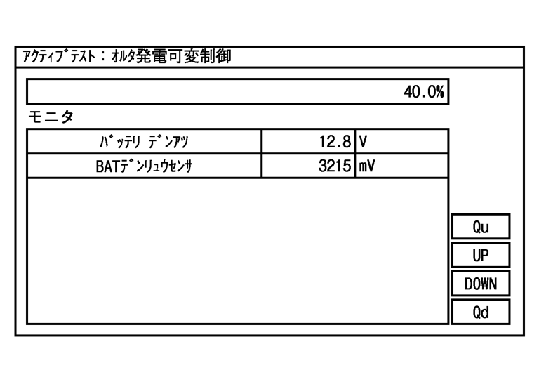- “エンジン”の“アクティブテスト”で、“オルタ発電可変制御”を選択し、オルタ発電可変制御のDUTY値を40%に設定したときの“バッテリ デンアツ”モニタ値を点検する。