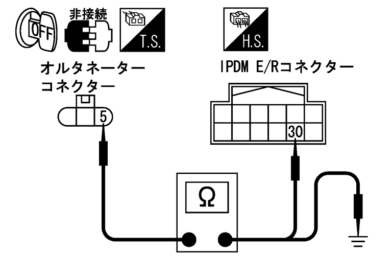 - オルタネーター5番端子〜IPDM E/R車両側ハーネスコネクター30番端子間の導通を点検する。