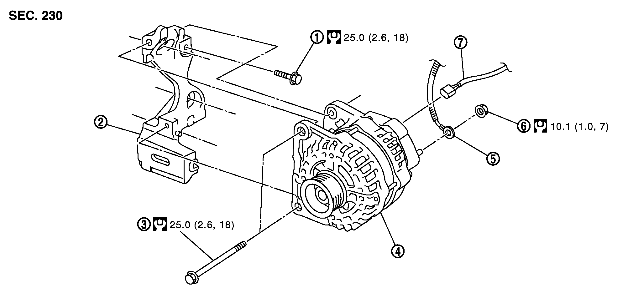 - オルタネーター取付ボルトの締め付けは、下側→上側の順で仮締め後、上側→下側の順で本締めする。■ 注意 ■オルタネーターは、フロント側(プーリー側)の取付面が基準面となっているため、基準面をオルタネーターブラケットに密着させ、取付ボルトを締め付けること。