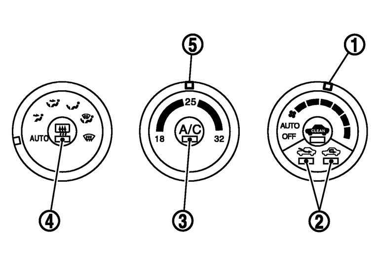 - 温度調節ダイヤル(5)を左右に回すごとに温度を1°Cずつ上下させて、+3°C~−3°Cまでを任意に選ぶことができる。右回転ではプラス設定、左回転ではマイナス設定となり、A/Cスイッチ内の表示灯(3)が設定温度との差の設定°C回数点滅する。(最大3回)。その際、差の設定がマイナスの場合は、RR DEFスイッチの表示灯(4)が点灯する。