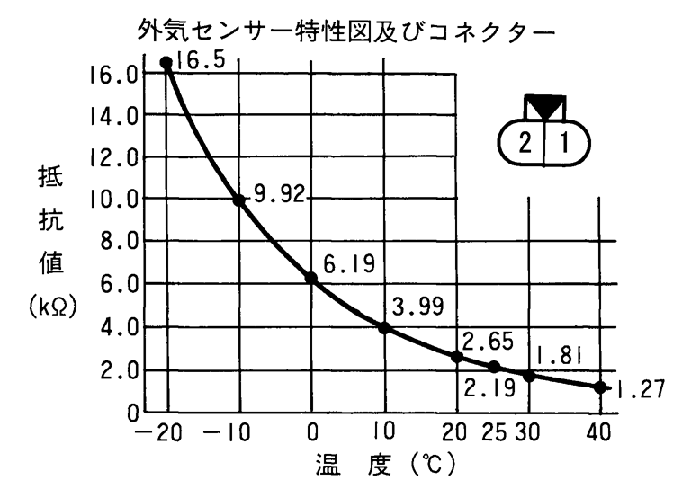 外気センサーコネクター1~2番端子間の抵抗値を点検する。