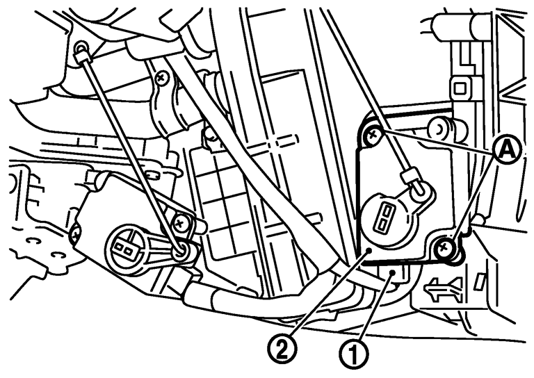 2.取付スクリュー(A)2本及びコネクター(1)を外し、エアミックスドアアクチュエーター(2)をエアコンユニットから取り外す。