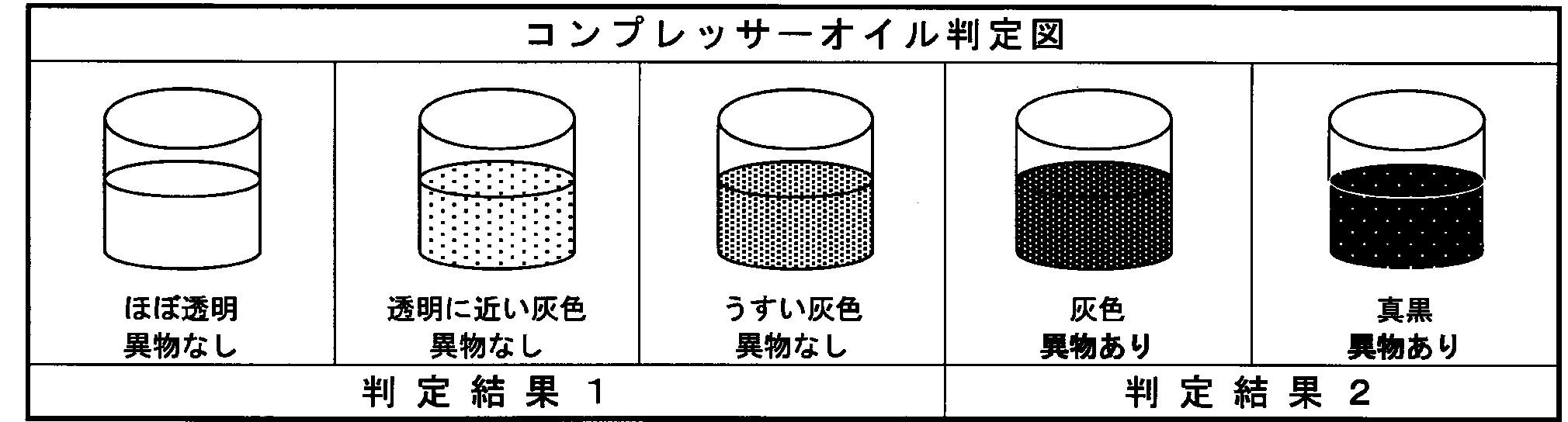 | コンプレッサーオイルの状態を点検 | コンプレッサーオイルを抜き取り、判定を行う | コンプレッサーオイル判定図により判定を行う | 判定結果1:コンプレッサーのみ交換 判定結果2:コンプレッサー及びリキッドタンク交換 | |