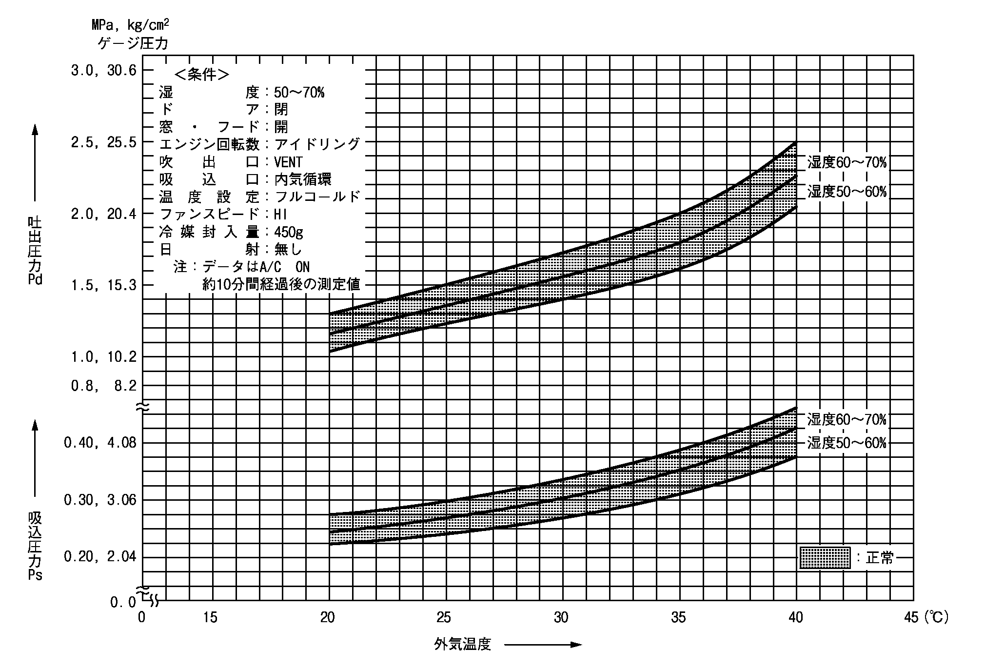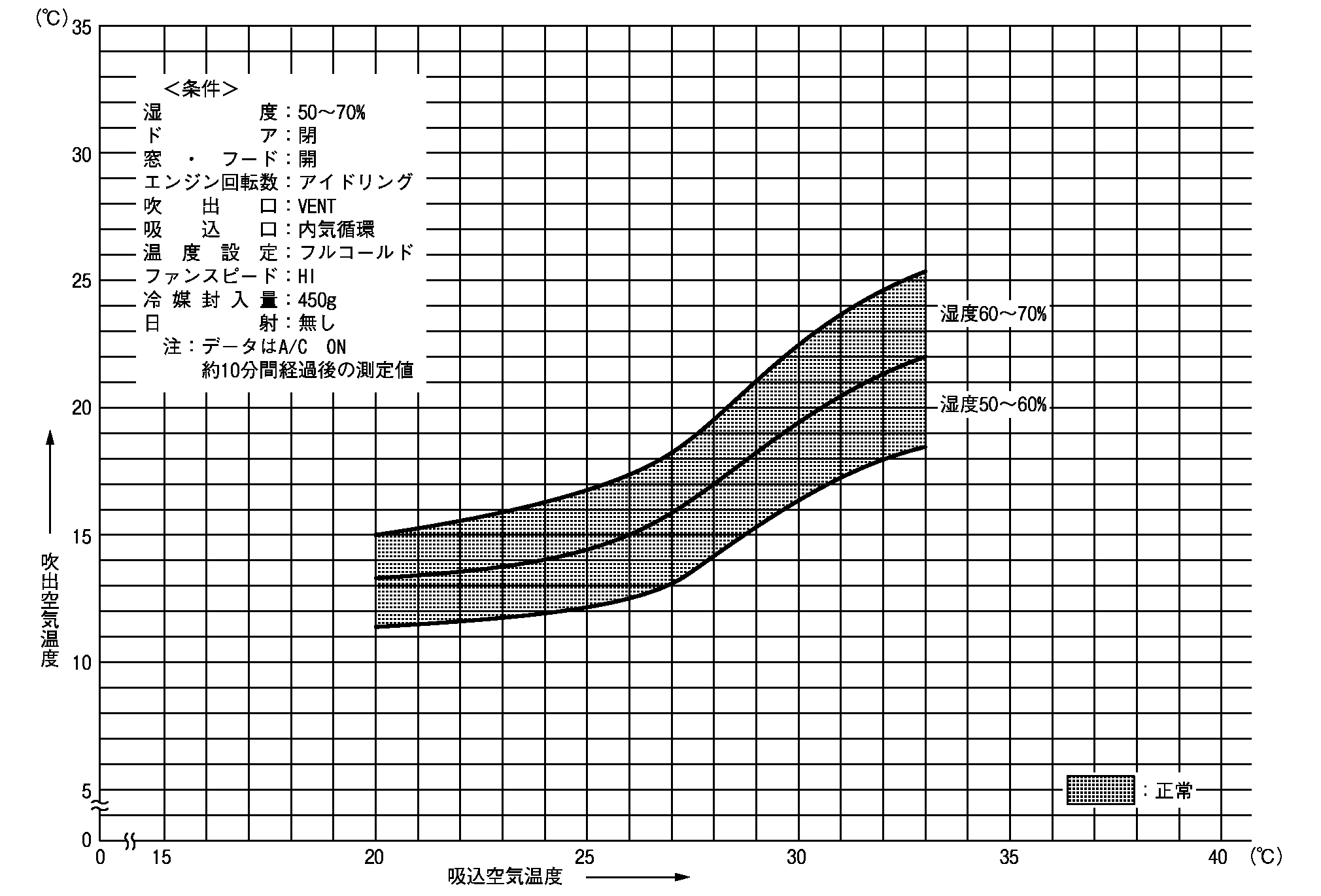 - 9.内気吸込口の温度及び湿度、吹出口の温度、クーラーサイクルの高圧及び低圧圧力を測定し、「外気温度―圧力特性」、「吸込温度―吹出温度特性」と照合して判定する。