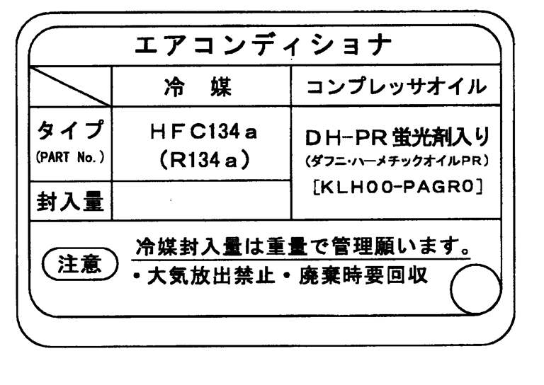 エンジンフード裏側左部に、冷媒及びコンプレッサーオイルの種類を記載し、蛍光剤が封入されていることを表示したコーションラベルを貼付した。