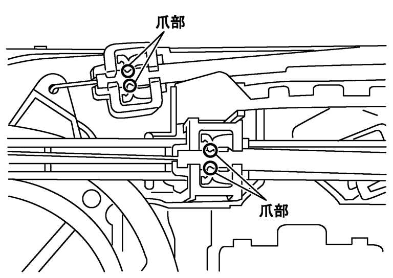 各ドアケーブルのインナーケーブルを図のように各レバーに取り付け、アウターケーブルを爪部に引っかかるまで押し当て固定する。