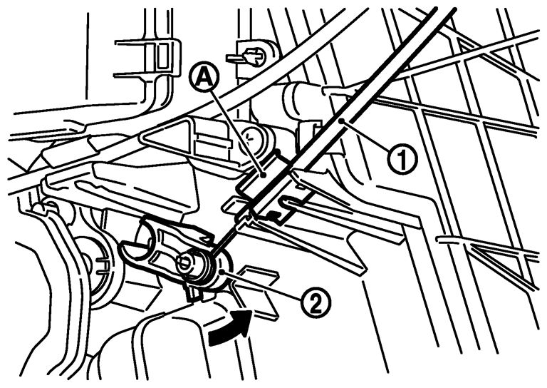 - 4.エアミックスドアレバー(2)を矢印方向に押し、アウターケーブルをコントローラー側に軽く引きながらクランプに取り付ける。